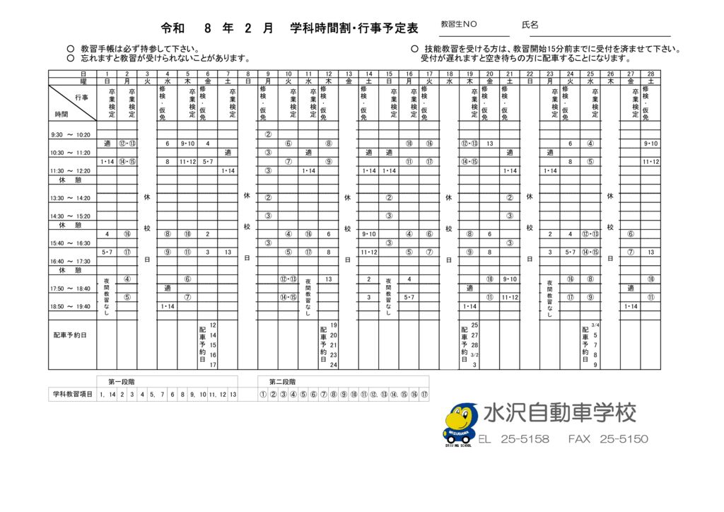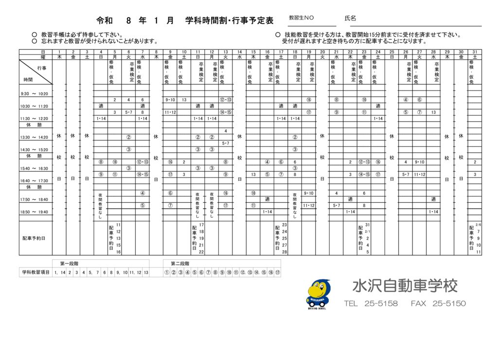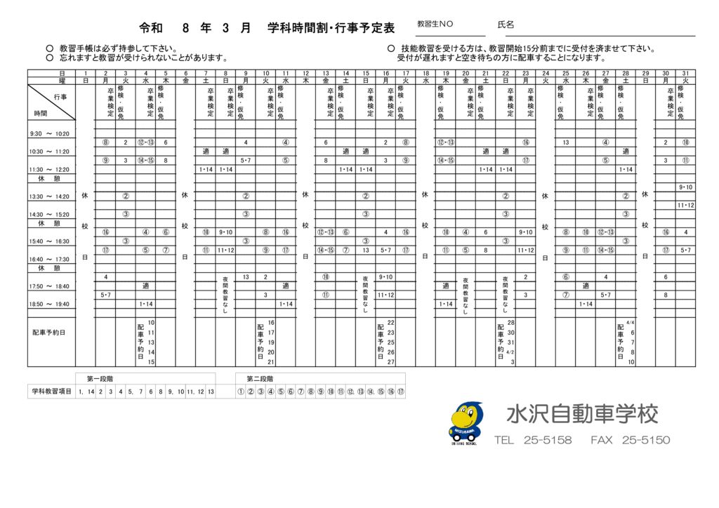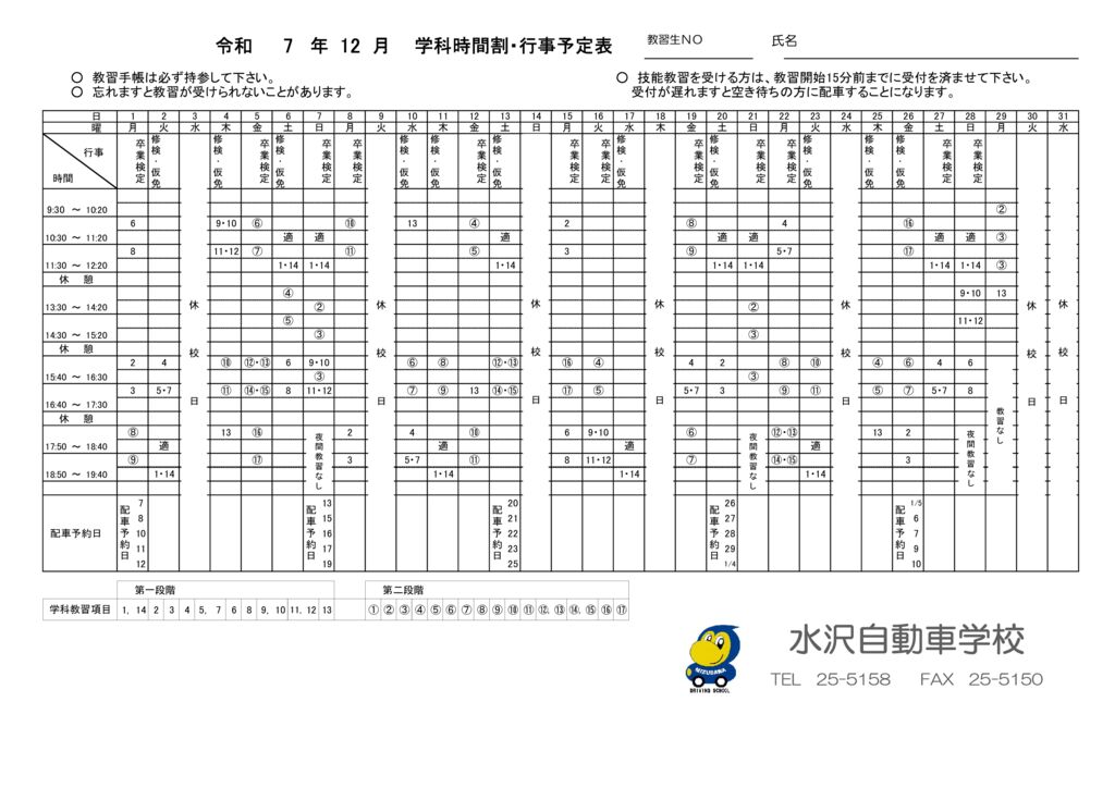 学科時間割・行事予定表